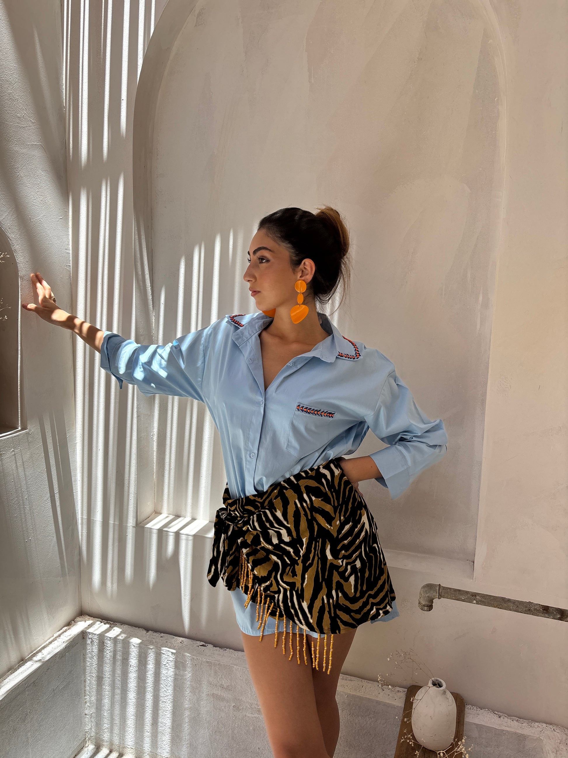 The Not So Basic Shirt takes your classic button-down and flips the script: oversized and airy, with a back crossover cut that moves with you. And just when you think it’s understated? The neckline and pocket say otherwise — stitched and beaded in the perfect pop of color.