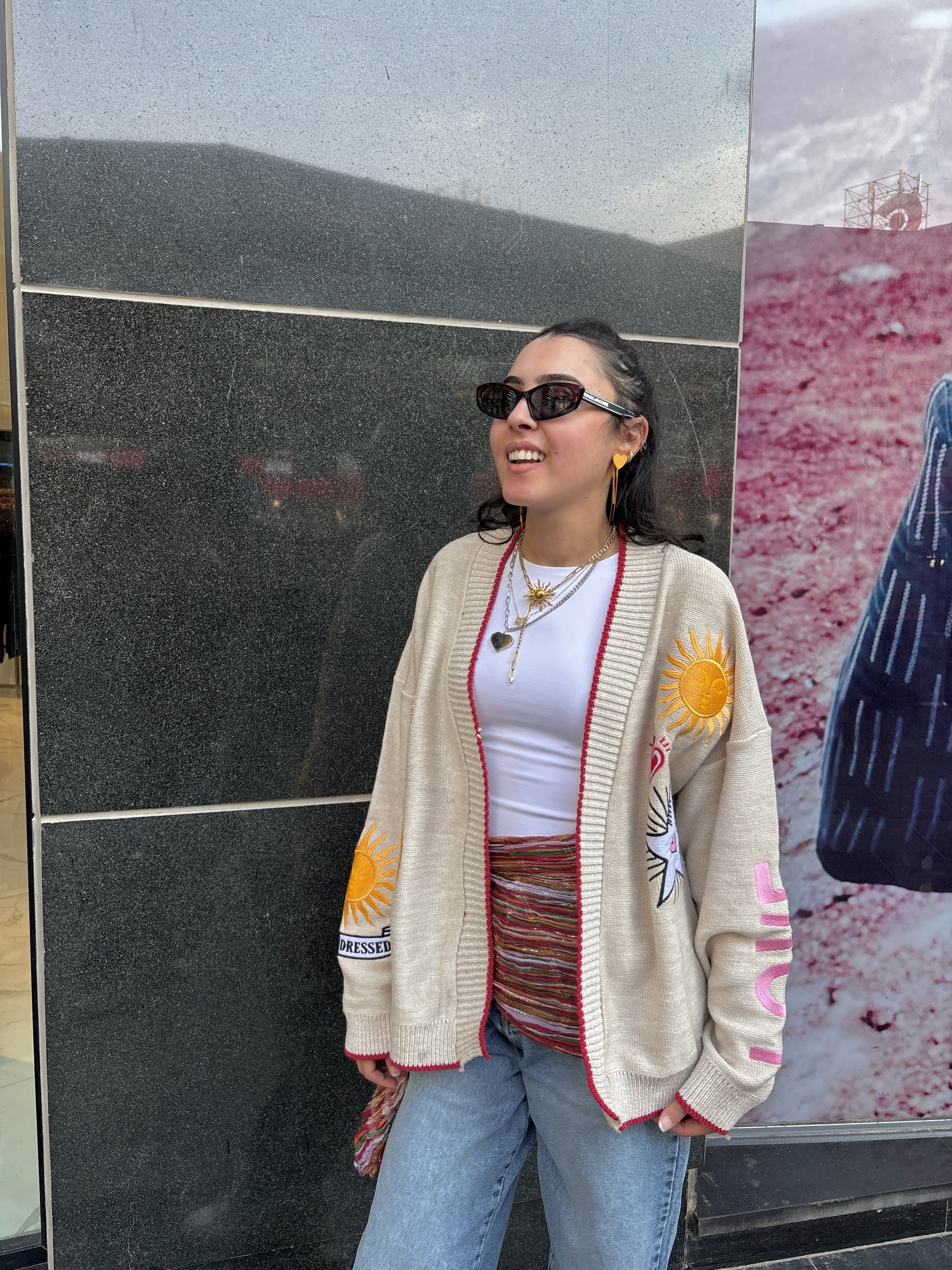 Part cardigan, part love story, this is the piece you'll reach for on chilly mornings and starry nights. Wrapped in camel warmth with a pop of fiery red trim, it's scattered with sunbursts, moons, and hearts - like your own little universe stitched into every inch.