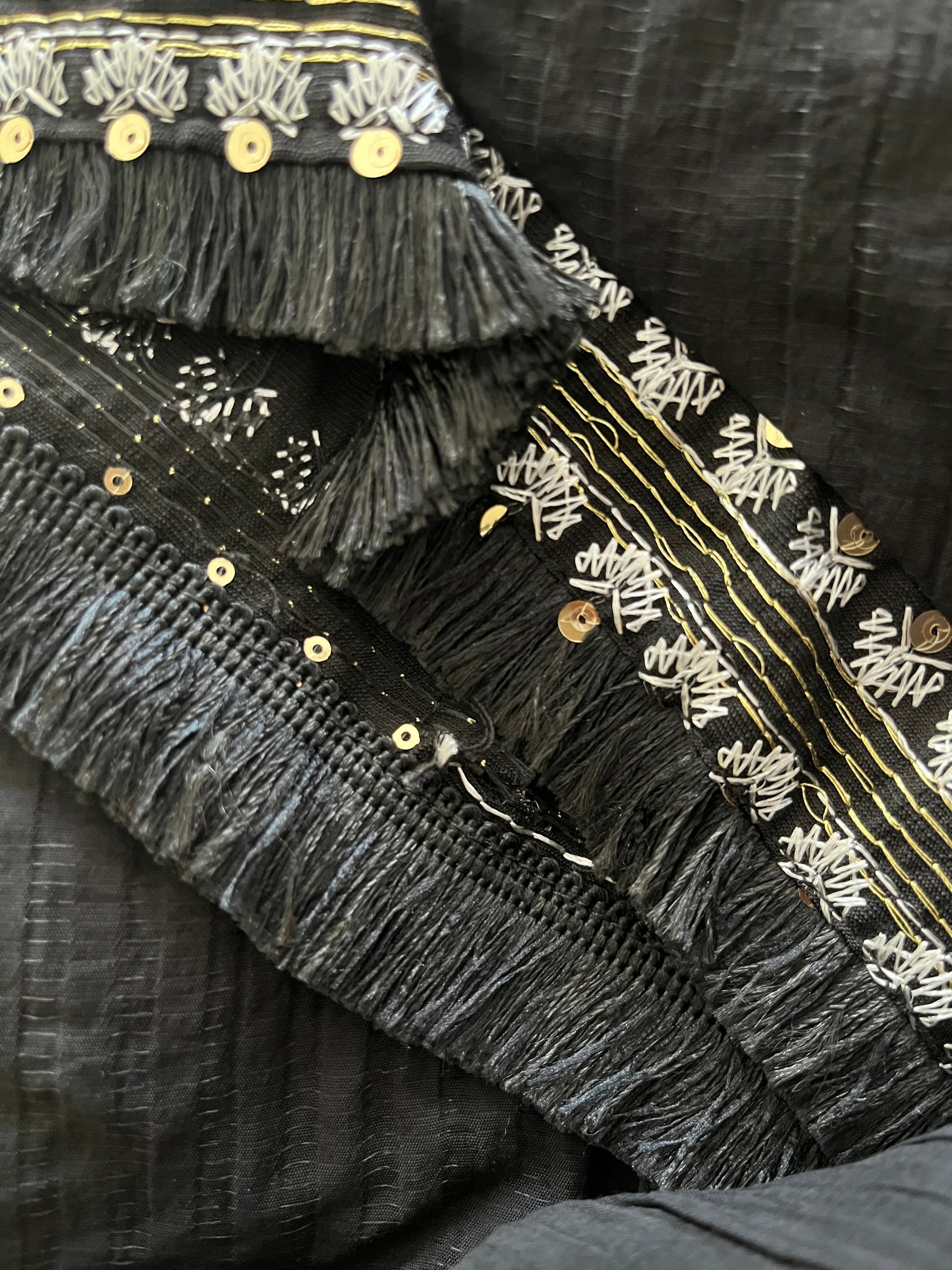 The bottom is finished with embroidery threaded with tiny mirrored accents and fringes that sway with every step — throwing off just the right glint to keep eyes on you. In effortless olive, it’s the piece you’ll throw on with jeans, shorts, or a skirt and still look like you tried … when you didn’t.